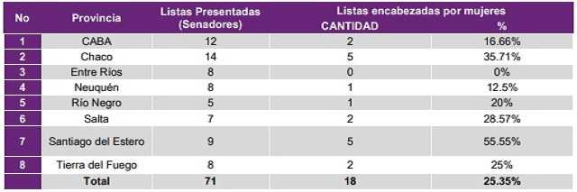 En ninguno de los ocho distritos que renuevan senadores este año (Ciudad de Buenos Aires, Chaco, Entre Ríos, Neuquén, Río Negro, Salta, Santiago del Estero y Tierra del Fuego) se registraron incumplimientos en cuanto a la ley de paridad. Se analizaron en total 71 listas, de las cuales 18 llevan a una mujer como primera candidata.