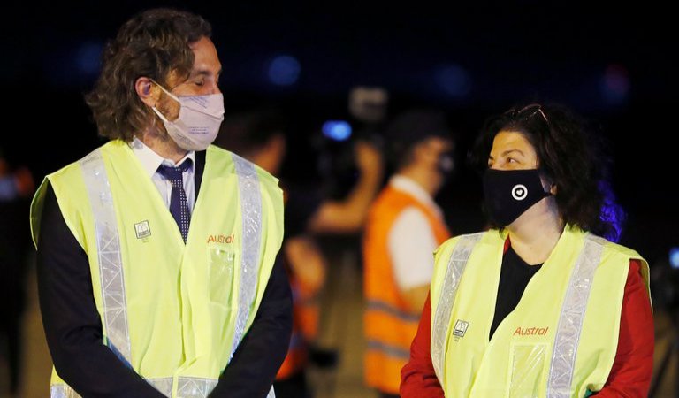 Cafiero y Vizzotti la noche del jueves en Ezeiza recibiendo el avión que trajo vacunas de China.