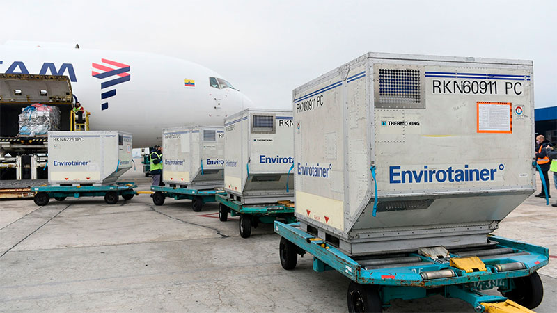 El vuelo LA 8585 de la empresa Latam Chile, proveniente de la ciudad de Miami, aterrizó en el aeropuerto de Ezeiza a las 14.57 y completó así un lote semanal de 2.320.500 del antígeno desarrollado en conjunto por el laboratorio sueco y la Universidad de Oxford.