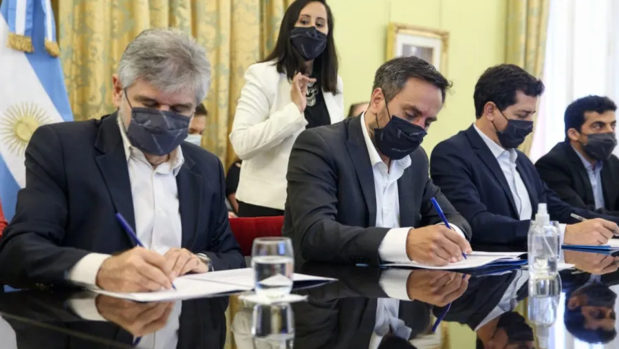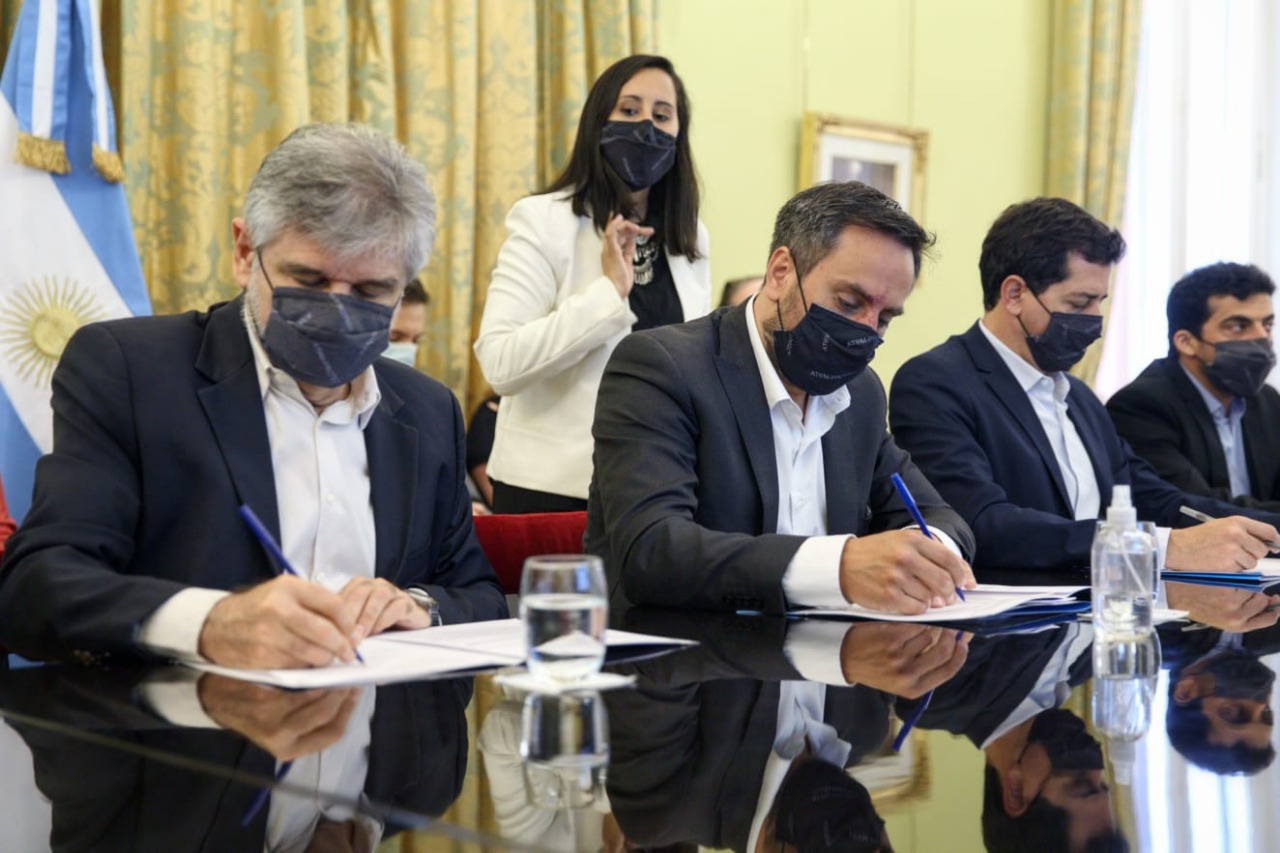 El ministro de Ambiente y Desarrollo Sostenible, Juan Cabandié; su par de Ciencia, Tecnología e Innovación, Daniel Filmus; y el presidente de la Administración de Parques Nacionales, Lautaro Erratchú, en compañía del ministro del Interior, Wado de Pedro, suscribieron este jueves, en Casa de Gobierno, un convenio para avanzar en la concreción de centros regionales de investigación en áreas protegidas de las provincias de Chaco, Jujuy, Entre Ríos, Santa Cruz, Río Negro y Tierra del Fuego, Antártida e Islas del Atlántico Sur.
