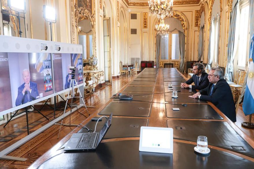 “La democracia hoy vive un momento singular, signada por extremos, por posiciones extremistas, su calidad institucional por momentos se debilita y eso es algo que debemos revisar y enfrentar con toda seriedad. Porque está visto que la democracia es el mejor mecanismo que existe para que los pueblos sean gobernados por quienes creen ser aquellos que son sus mejores representantes. En Latinoamérica estamos viviendo un proceso singular, donde muchos países del continente van cambiando sus gobiernos y los procesos democráticos se van consolidando”, arrancó Fernández con su exposición después del agradecimiento de ocasión a Biden por la convocatoria.
