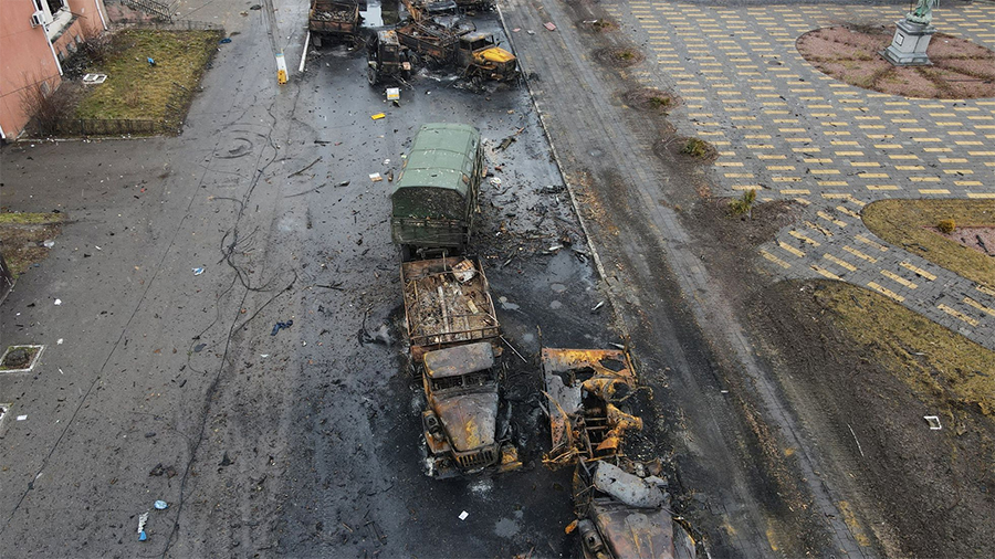 Imagen captada por un dron de vehículos militares rusos calcinados en una calle de Borodyanka, en la región de Kiev, el 3 de marzo.