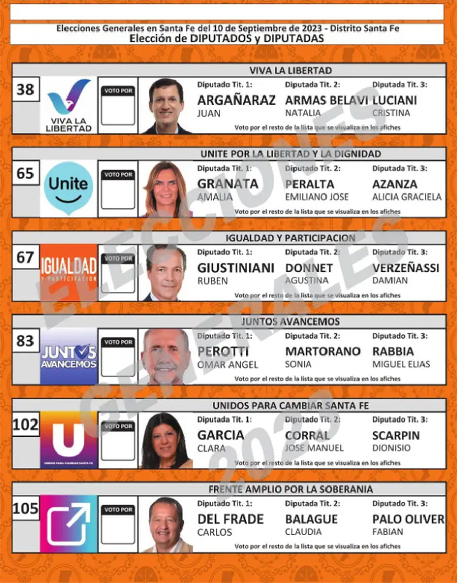 Si bien las listas completas con todos los candidatos a diputado figurarán en afiches dispuestos dentro de los colegios electorales, la boleta única en esta categoría permite leer a los tres primeros postulantes en esta categoría dentro de los siguientes espacios políticos: