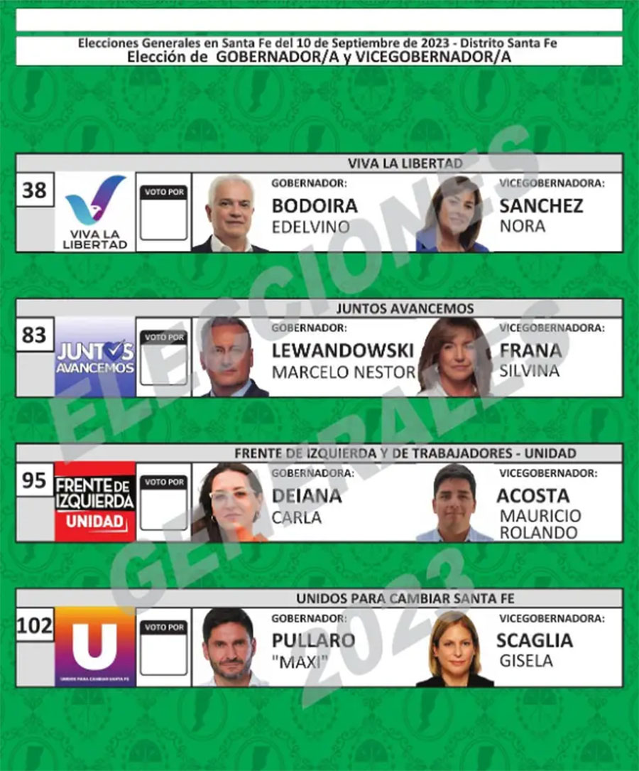 En los comicios santafesinos, además de elegir gobernador y vice, se renovarán 50 diputados y 19 senadores provinciales, 46 intendentes, 217 concejales y más de 1600 miembros de comunas. Como los votantes santafesinos saben, a la hora de emitir su voto se les asignan cinco boletas únicas, diferenciadas por color según su categoría, que deben introducirse en distintas ranuras de la urna.