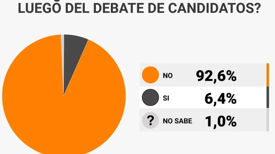 Tras el encuentro de los cinco postulantes para suceder a Alberto Fernández en la Presidencia el próximo 22 de octubre, el sondeo elaborado por la consultora Zuban Córdoba y Asociados expone que el 92,6% de los encuestados no modificará su voto luego de escuchar las propuestas de los postulantes.