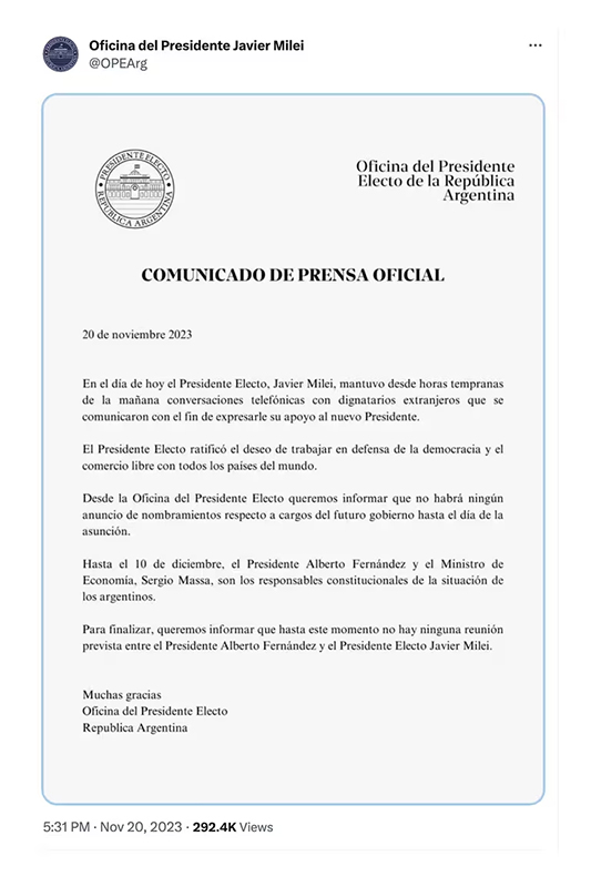 “En el día de hoy el presidente electo, Javier Milei, mantuvo desde horas tempranas de la mañana conversaciones telefónicas con dignatarios extranjeros que se comunicaron con el fin de expresarle su apoyo al nuevo Presidente”, dice el primer comunicado de prensa. Y agrega: “El Presidente electo ratificó el deseo de trabajar en defensa de la democracia y el comercio libre con todos los países del mundo”.