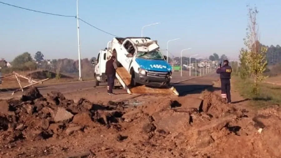 Fue en plena obra de reparación de la rotonda de acceso a Villa Adela, barrio ubicado al sur del ejido urbano de Concordia. El vehículo involucrado es una camioneta de la Policía de Entre Ríos que parece haber volcado, dado el daño que presenta en el techo.