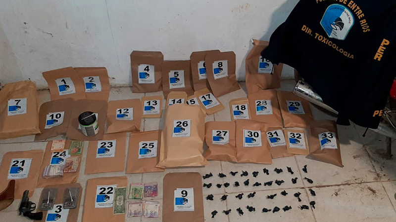 Hubo operativos de narcomenudeo en Concepción del Uruguay. En la oportunidad incautaron envoltorios fraccionados de cocaína y marihuana listas para su comercialización, balanzas digitales, varios elementos y sustancias de corte o estiramiento, dinero en efectivo, telefonía celular, un vehículo marca Fiat Siena, una motocicleta Yamaha, un revólver, calibre 22, cartuchería del mismo calibre, una computadora, entre otros elementos que tienen amplia vinculación a la causa investigada.