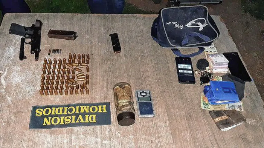 Con el pedido del fiscal Santiago Alfieri y la autorización del juez de Garantías, Juan Carlín, el personal de la División Homicidios allanó su domicilio de calle La Paz, donde secuestró un arma de fuego calibre 45, un tubo cañón de reserva mismo calibre, 82 cartuchos calibre 45, tres almacenes cargadores para ese tipo de balas, ocho gramos de marihuana, 15.000 pesos, dos celulares y una balanza de precisión.