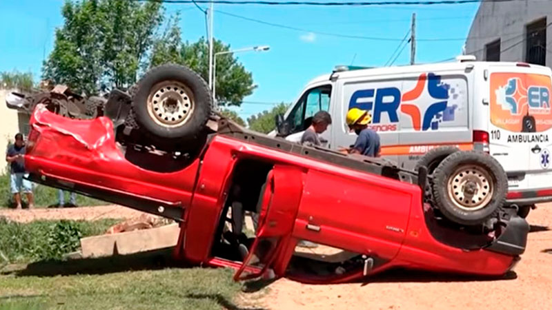 Por causas que se deberán establecer, en la intersección de calles Federación y Federik chocaron dos camionetas, una Chevrolet, color gris y una Mitsubishi, color roja. Esta última, a causa del fuerte impacto terminó con sus cuatro ruedas hacia arriba.