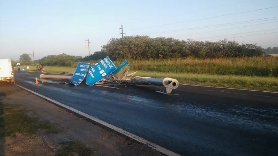 Ante esta situación, de frente circulaba un automóvil Chevrolet Prisma, con tres ocupantes, quienes colisionaron el cartel y terminaron en la banquina.