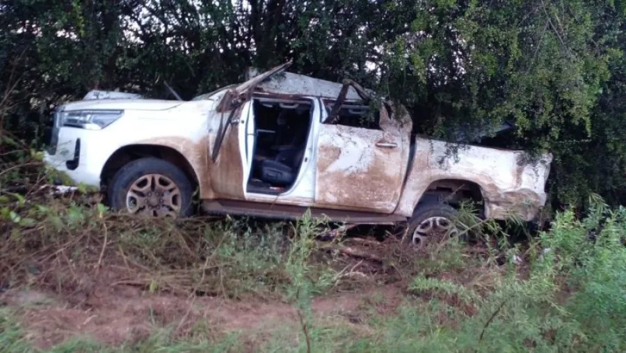 Tras el impacto, el Renault Logan quedó "colgado" en la banquina, pero no volcó. En cambio, la camioneta se desplazó hacia la banquina y chocó contra una cortina de árboles, dejando al conductor atrapado en su interior.