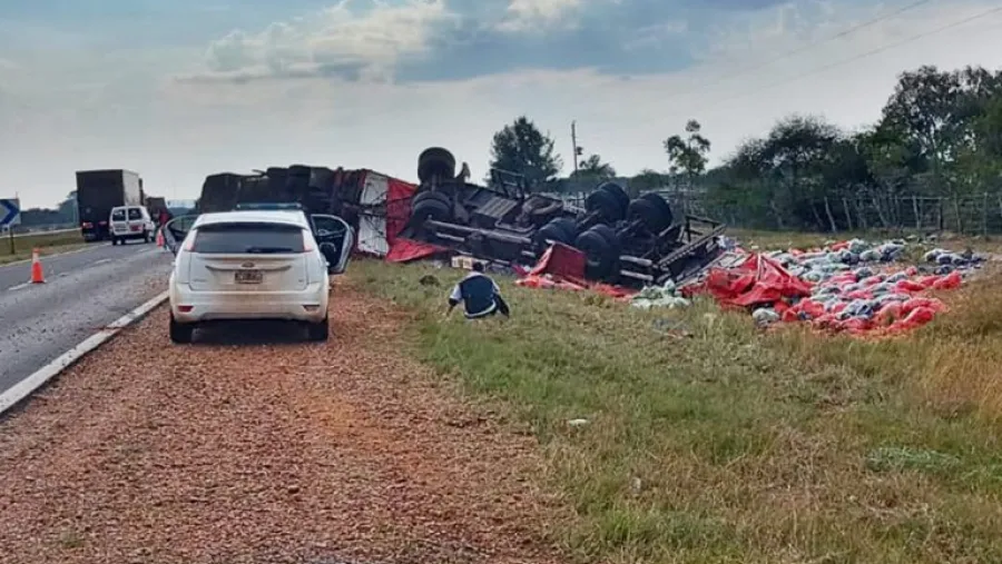 Un camión volcó y desparramó su mercadería en la Autovía 14, saliendo de Chajarí