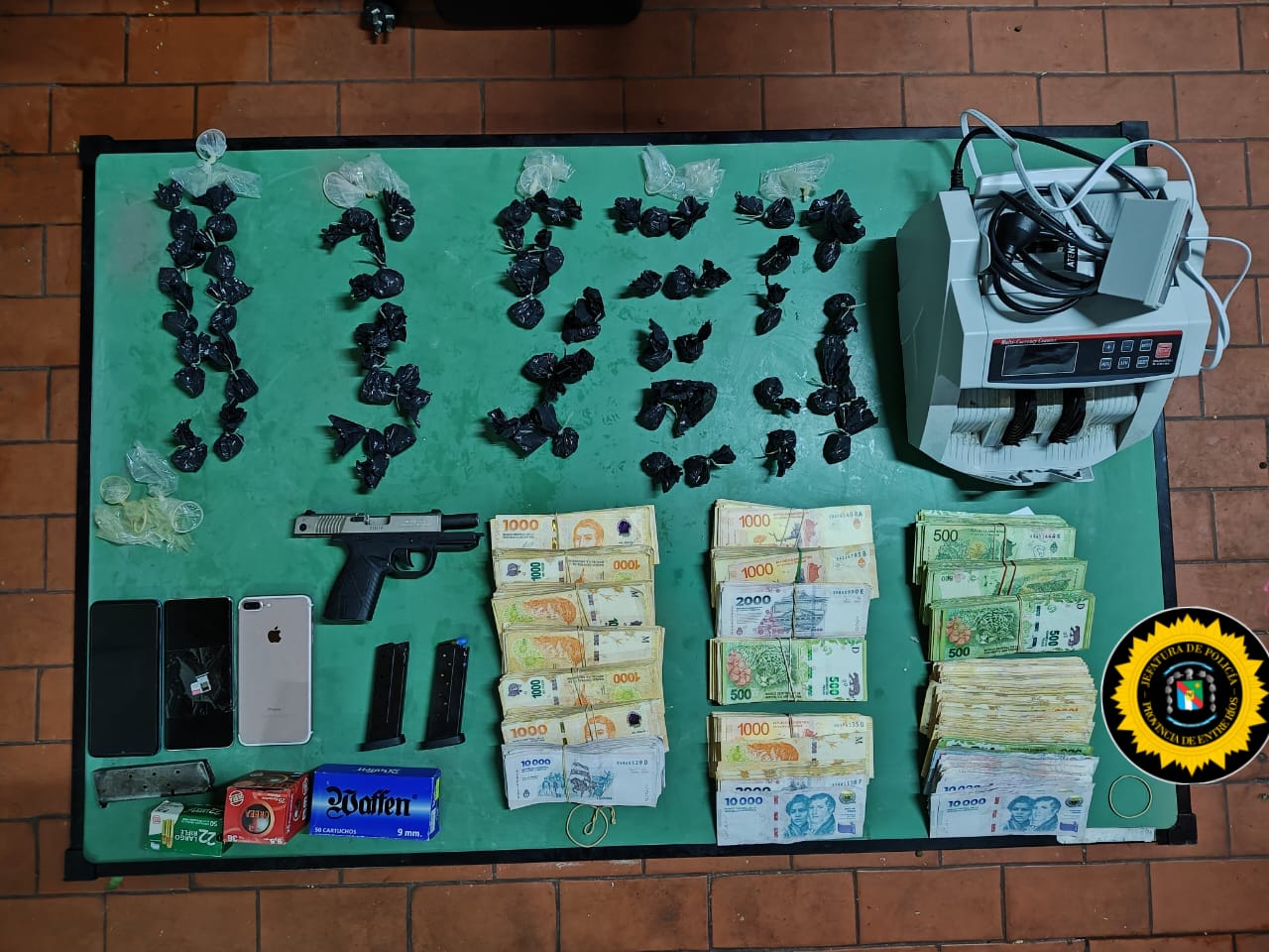 En una vivienda en la ciudad de Colón se localizaron 50 envoltorios con droga, casi 3 millones de pesos, una máquina contadora de billetes, una pistola calibre 9 milímetros, con 32 cartuchos y 42 balas más calibre .22. Se secuestró además una camioneta Toyota Hilux y un auto VW Bora. Dos hombres y una mujer, todos familiares, quedaron detenidos.