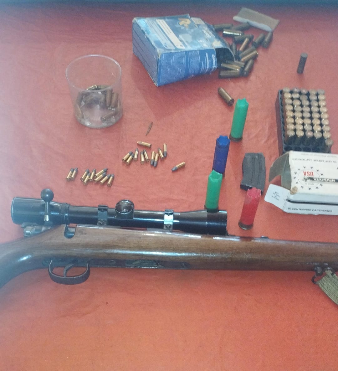 En el lugar se notificó a Camejo, de 59 años, y se secuestró una carabina calibre .22 con mira telescópica, con siete cartuchos. También se localizaron otras 20 balas iguales, 13 cartuchos calibre 9 mm., 62 calibre 44 mm., y cuatro vainas calibre 12.