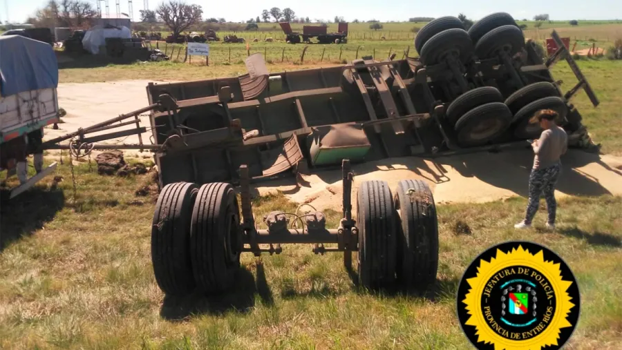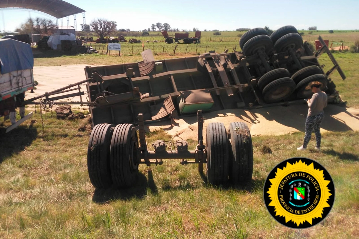 De acuerdo a lo informado por el conductor, otro vehículo que circulaba de frente en maniobra de sobrepaso lo obligó a correrse hacia la banquina. Esa maniobra derivó en la pérdida de estabilidad y el vuelco del acoplado cargado.