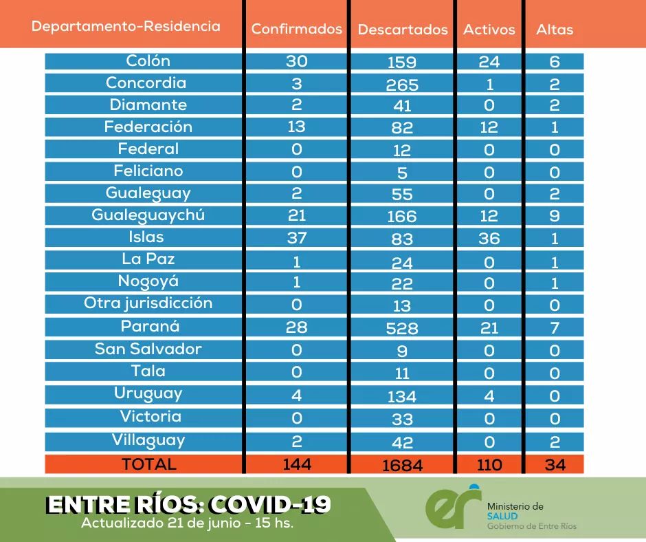 Se registraron nueve nuevos casos de coronavirus en Entre Ríos, según confirmó este domingo el área de Vigilancia Epidemiológica del Ministerio de Salud y de este modo ya suman 144 los contagiados en la provincia.