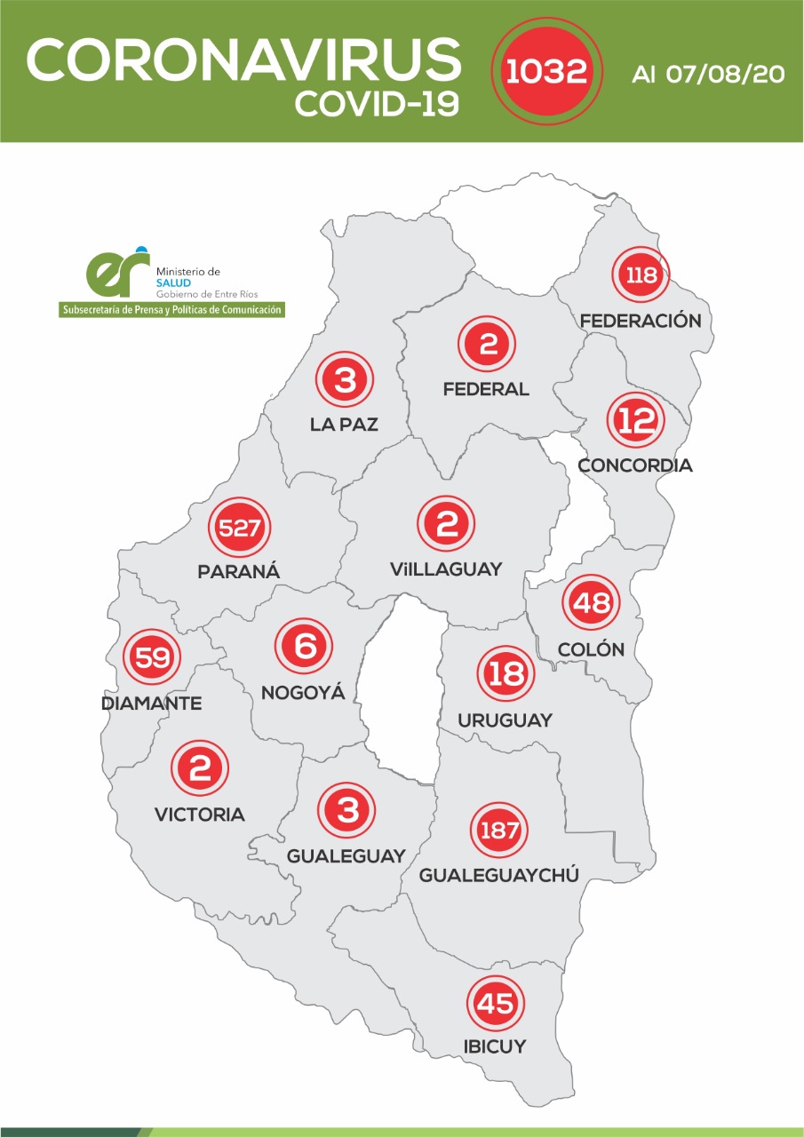 Los primeros 54 fueron detectados en el Departamento Paraná, 48 corresponden a la ciudad capital, de los cuales 21 tuvieron contacto estrecho con casos confirmados previamente y 27, sus nexos epidemiológicos se encuentran en estudio. Asimismo, uno confirmado pertenece a la localidad de Viale; tres a la localidad de Colonia Avellaneda; y uno a Aldea María Luisa. Todos ellos son contactos estrechos de casos previamente confirmados. Por último, en la ciudad de San Benito se detectó 1 caso, del cual su nexo epidemiológico se encuentra en investigación.