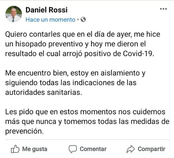 Domingo Daniel Rossi, intendente de Santa Elena y ex vicegobernador informó que dio positivo para Covid-19. Dio a conocer ayer la noticia, a través de la red social Facebook, donde días atrás también había contado que permanecía en aislamiento por presentar un cuadro de bronquitis.