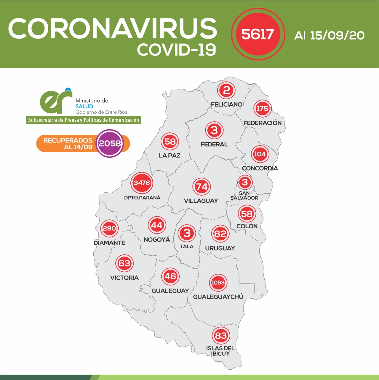 El área de Vigilancia Epidemiológica confirmó que este martes en Entre Ríos se registraron 180 nuevos casos de coronavirus. La distribución por departamento es la siguiente: