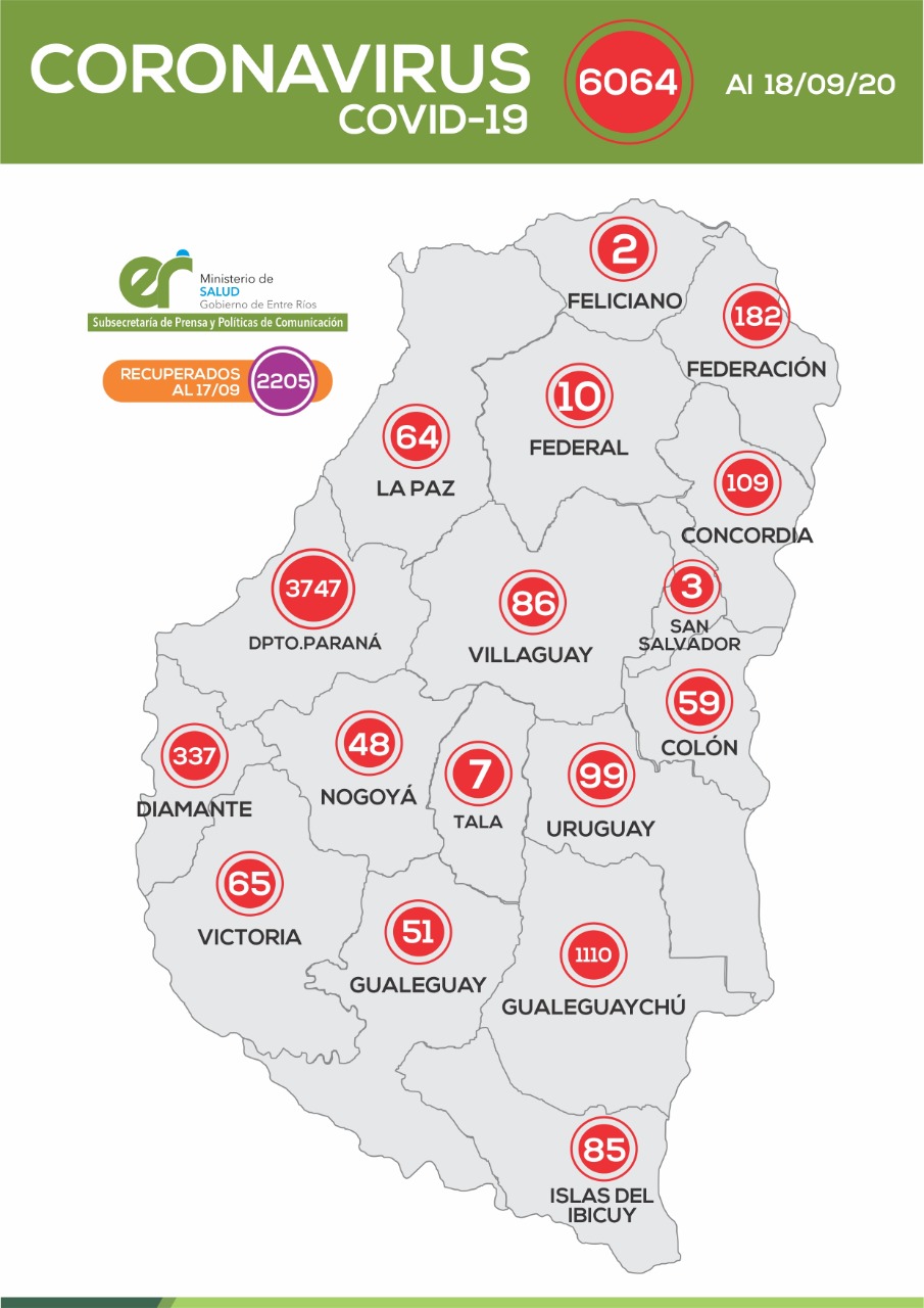 El área de Vigilancia Epidemiológica, confirmó que este viernes en Entre Ríos se registraron 173 nuevos casos de coronavirus, que se distribuyen departamentalmente de la siguiente manera: