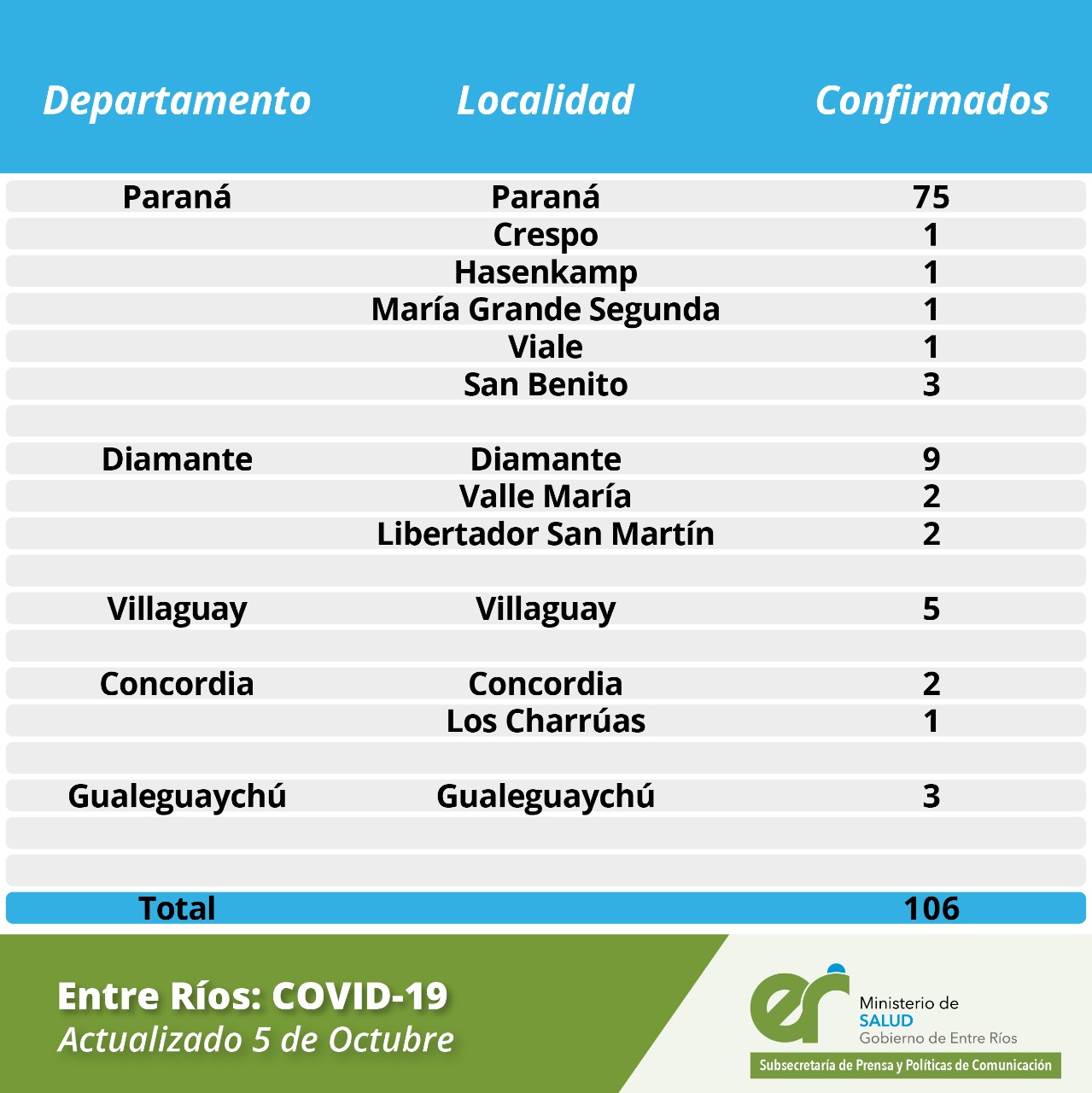 El área de Vigilancia Epidemiológica, confirmó que este lunes en Entre Ríos se registraron 106 nuevos casos de coronavirus, que se distribuyen departamentalmente de la siguiente manera: