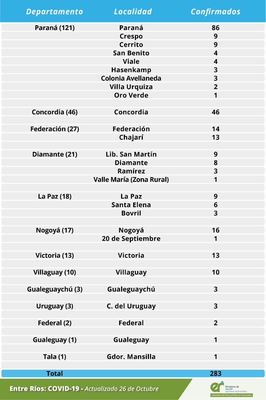 El área de Vigilancia Epidemiológica del Ministerio de Salud, confirmó que en Entre Ríos este lunes se registraron 283 nuevos casos de coronavirus. Del total, en el Departamento Paraná hubo 121, 86 de ellos en Paraná. De ese modo, en la provincia son 14.301 los casos confirmados.