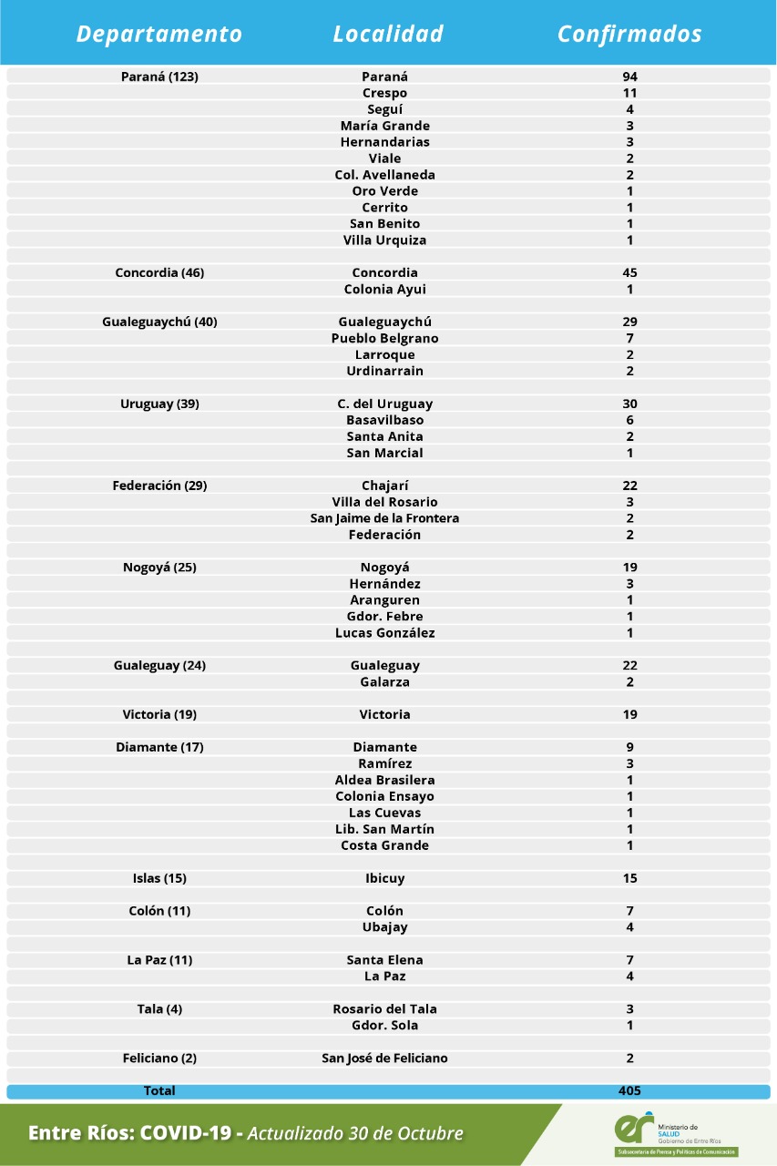 El área de Vigilancia Epidemiológica del Ministerio de Salud confirmó que en Entre Ríos este viernes se registraron 405 nuevos casos de coronavirus. De ese modo, en la provincia son 15.847 los casos confirmados. Del total de esta jornada, 123 se confirmaron en Departamento Paraná, 94 de ellos en la capital entrerriana.