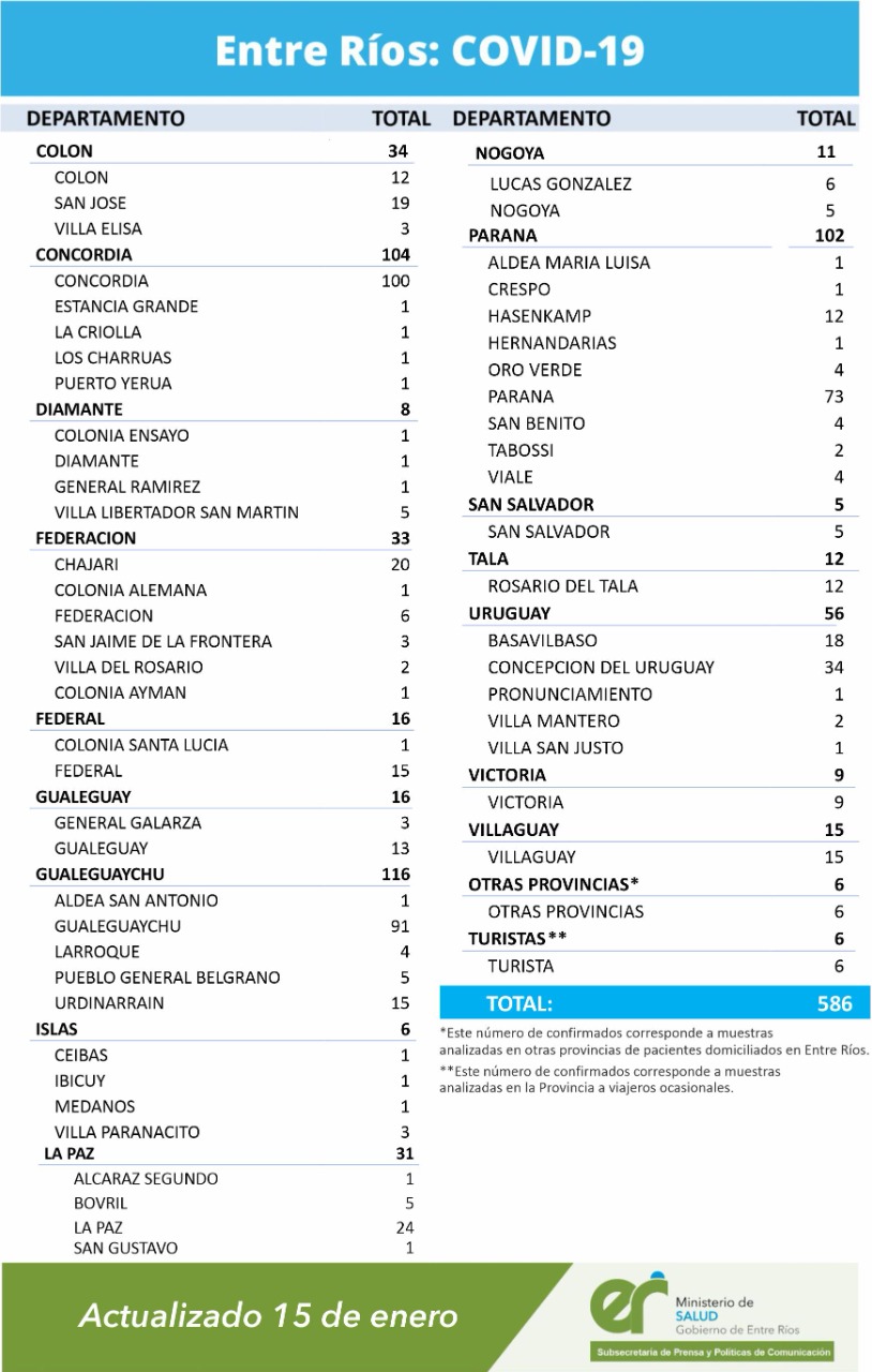 El gobierno provincial dio a conocer el parte respecto a los nuevos contagios de Covid-19 en la jornada de viernes. Entre Ríos sumó 586 nuevos casos, de los cuales 102 son del departamento Paraná y 116 del departamento Gualeguaychú. Concordia incrementó su total en 104 nuevos casos de coronavirus. De ese modo, en la provincia son 37.697 los confirmados.