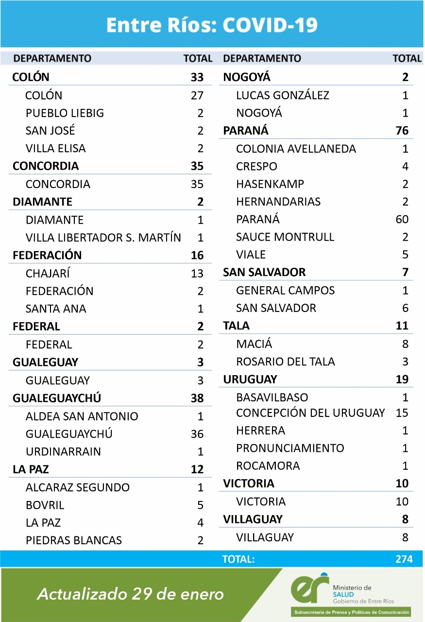 El gobierno provincial informó 274 nuevos casos de coronavirus en Entre Ríos este viernes. El dato significa la confirmación de la baja de casos durante el transcurso de esta semana que pasó. Del total de casos registrados, sobresale el departamento Paraná con 76 positivos de los cuales 60 son de la ciudad capital.