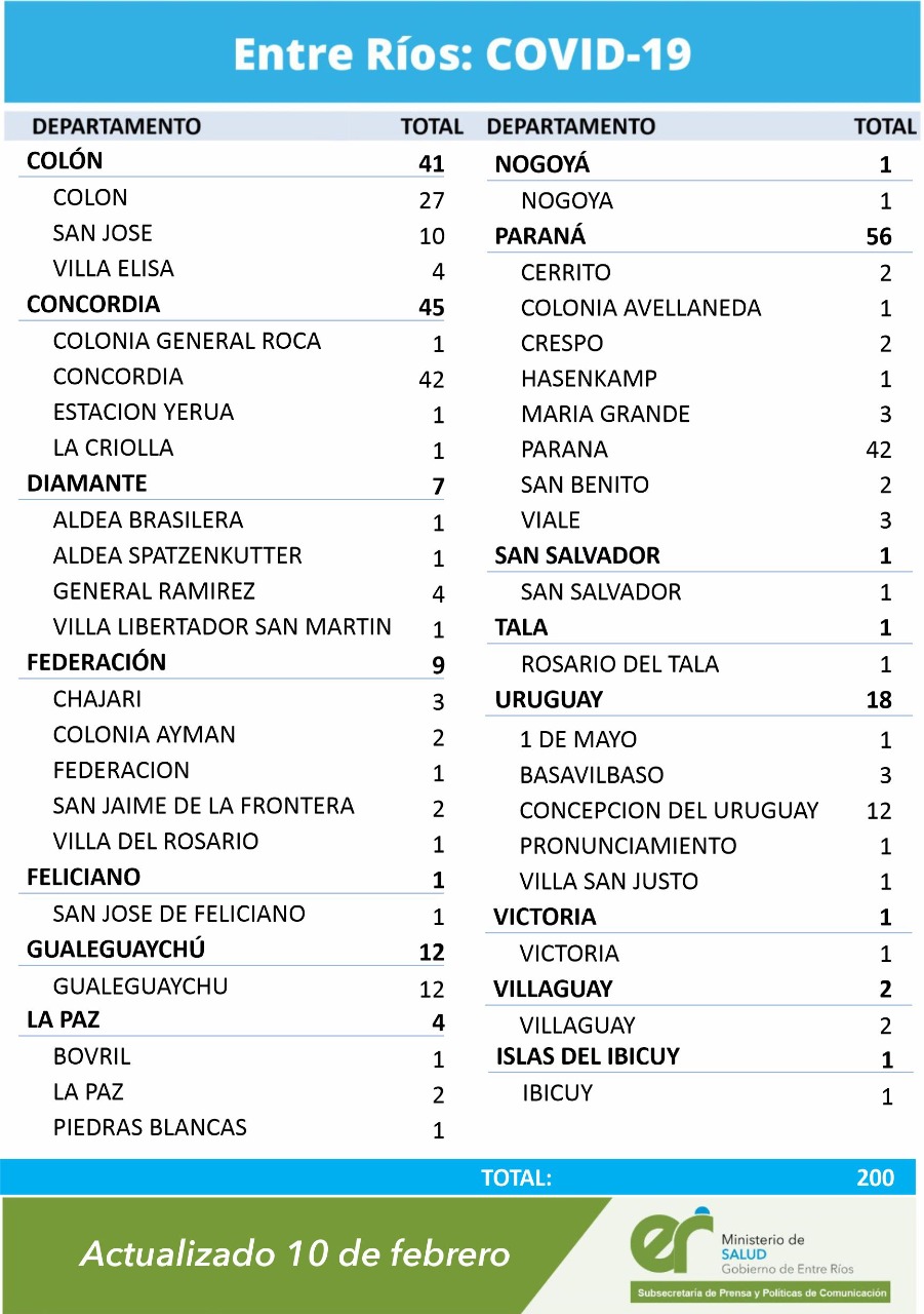 Según el reporte epidemiológico de la provincia, este miércoles hubo 200 nuevos casos de coronavirus y de ese modo, Entre Ríos alcanzó los 45.133 casos desde el inicio de la pandemia. De los casos de este miércoles, 56 fueron del departamento Paraná (42 ciudad), 41 Colón (27 ciudad) y 45 Concordia (42 ciudad).
