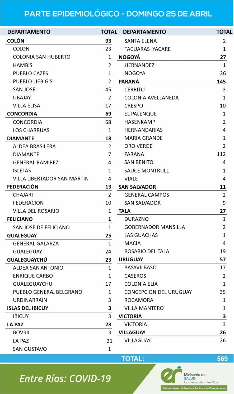 El área de Vigilancia Epidemiológica del Ministerio de Salud confirmó que en Entre Ríos este domingo se registraron 569 nuevos casos de coronavirus. Del total, 145 fueron en Departamento Paraná, 112 de ellos en la capital entrerriana. De ese modo, en la provincia son 60.764 los casos confirmados.