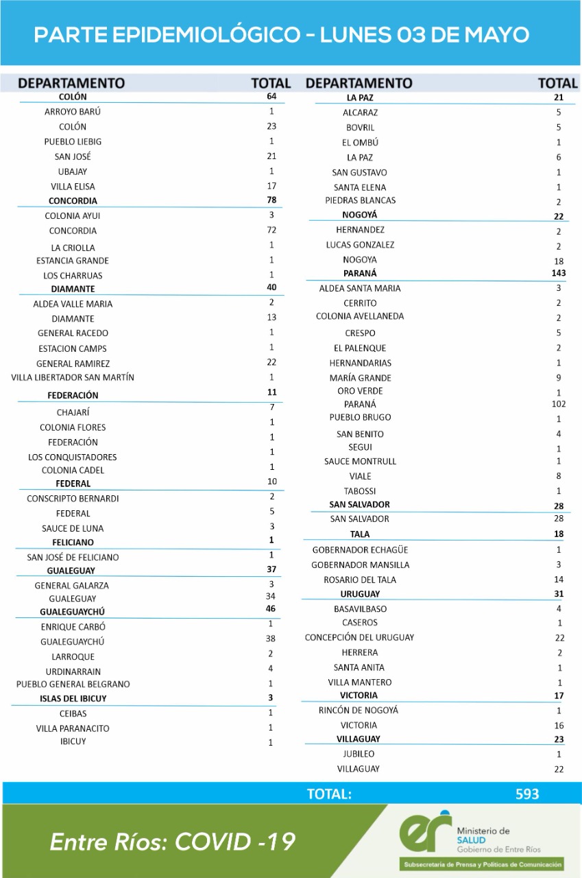 Según se destacó, “estos registros obedecen a la restricción operativa impuesta por el feriado del 1ro de Mayo y no laborable del domingo. Como consecuencia de ello, los 593 casos corresponden a la suma de los dos días”. De los nuevos contagios, 143 se registraron en Departamento Paraná, 102 de ellos en la capital provincial.