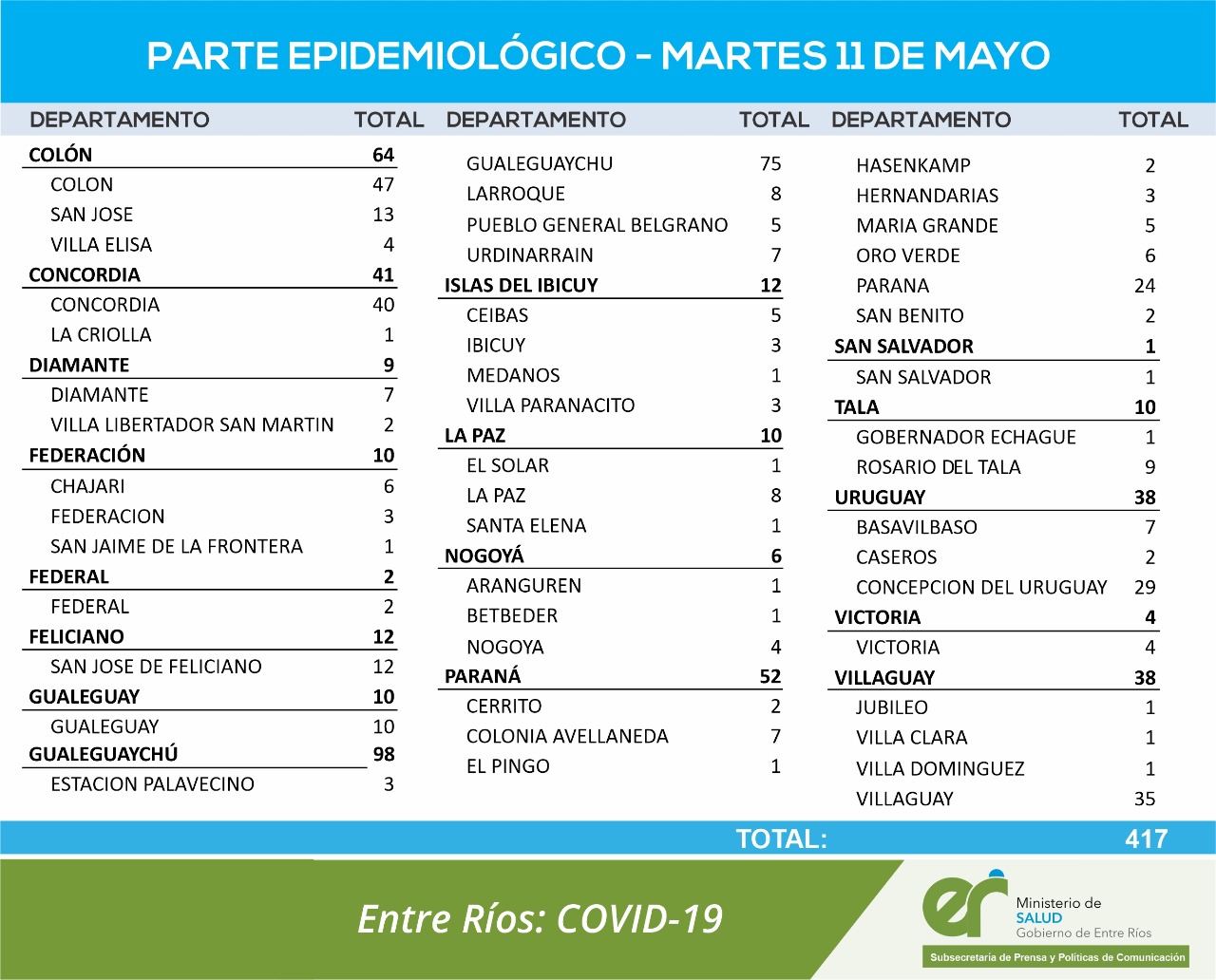 Gualeguaychú es el departamento que más casos registró ya que alcanzó los 98 nuevos contagios. El departamento Paraná tuvo 52 contagios -en un promedio que arroja un resultado de 115 casos diarios la última semana-, el departamento Colón sumó 64 nuevos casos. El registro señaló que Concordia aumentó sus registros con 41 contagios. De ese modo, en la provincia son 68.872 los casos confirmados.