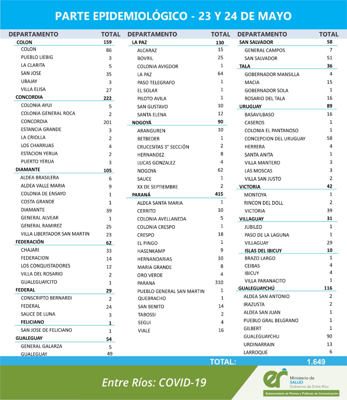 El departamento Paraná registró 415 nuevos casos.
