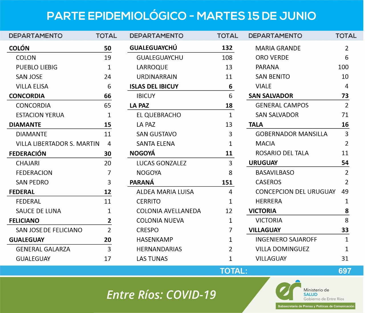 La provincia continúa con una tendencia a la baja de casos y registró 697 nuevos contagios en el reporte de este martes. Cabe aclarar, que los martes es el día que menos casos se registran por la cantidad de testeos. La única excepción es la del departamento Gualeguaychú, ya que los martes siempre registra un promedio de testeos superior y hoy sumó 132 nuevos casos.