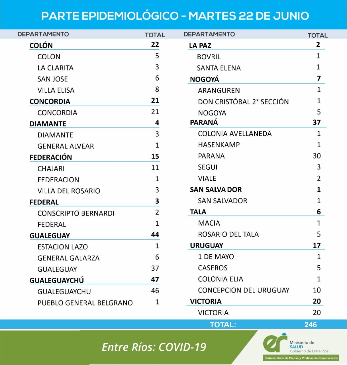 La provincia informó el registro más bajo de los últimos meses con 246 nuevos casos de coronavirus. Cabe aclarar que los martes es el día de la semana que habitualmente el promedio diario de casos informados disminuye por la cantidad de testeos realizados e informados. Desde abril no había registros de similares características.