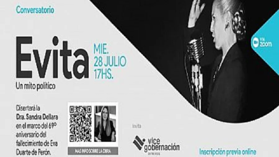 La Vicegobernación de Entre Ríos invita a participar del Conversatorio: "Evita, un mito político" que se desarrollará este miércoles 28 de julio a las 17 horas vía zoom, en el marco del 69° aniversario del fallecimiento de Eva Duarte de Perón. La actividad estará a cargo de la doctora Sandra Dellara.