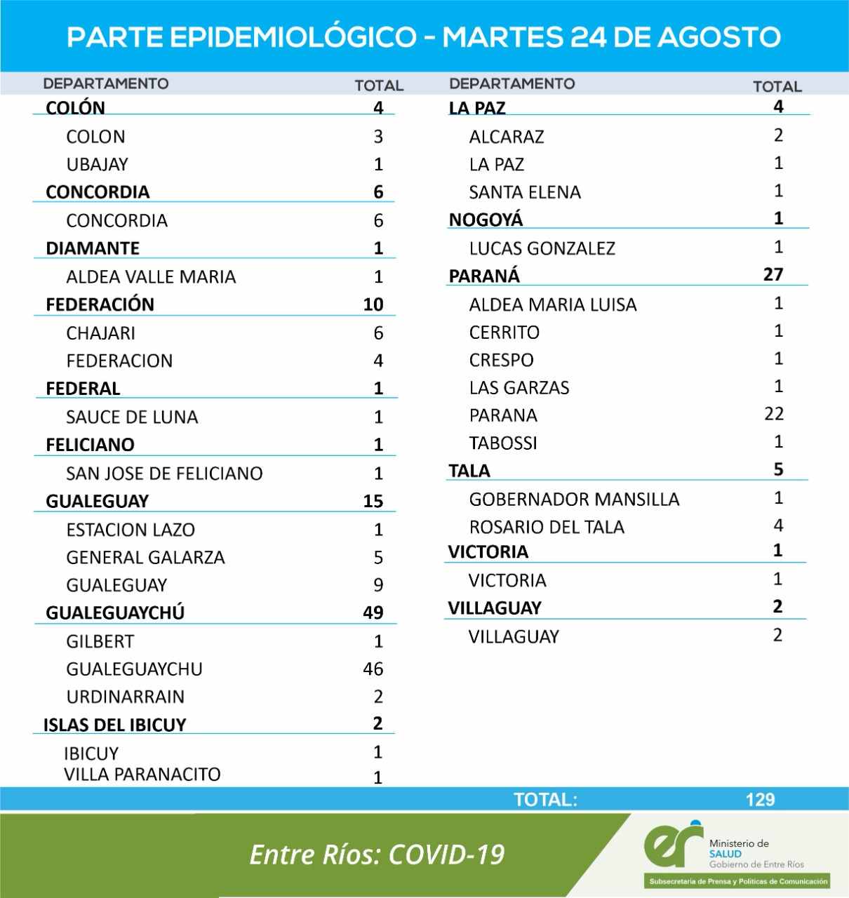 Según el reporte provincial, Entre Ríos incrementó en 188 casos el total de contagiados desde el inicio de la pandemia. El Área de Vigilancia Epidemiológica informó este miércoles 188 contagios de los cuales 60 son del departamento Paraná. En cuanto a las víctimas fatales, este miércoles sólo se informó el fallecimiento de una mujer de 44 años oriunda de Gobernador Mansilla. Al momento de fallecer, estaba internada en el Hospital Urquiza de Concepción del Uruguay.