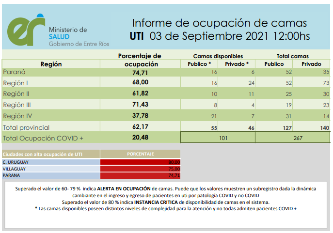 La ocupación de camas es otro de los elementos a tener en cuenta. Sobre el total de Unidades de Terapia Intensiva, la provincia tiene un 62,17% ocupadas. De las camas ocupadas, tan sólo el 20,48% corresponde a patología Covid-19. La novedad, según el reporte, es que la ciudad de Concepción del Uruguay informó un 80% de sus camas ocupadas justo al límite de la categoría crítica de ocupación.