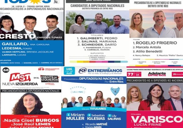 En el cuarto oscuro habrá diez propuestas: una del Frente de Todos, una del Movimiento Socialista de los Trabajadores, una por el Partido NOS; una por el Nuevo Más; dos por el Socialismo, tres por Juntos por Entre Ríos y, por fuera de la interna, una boleta radical.
