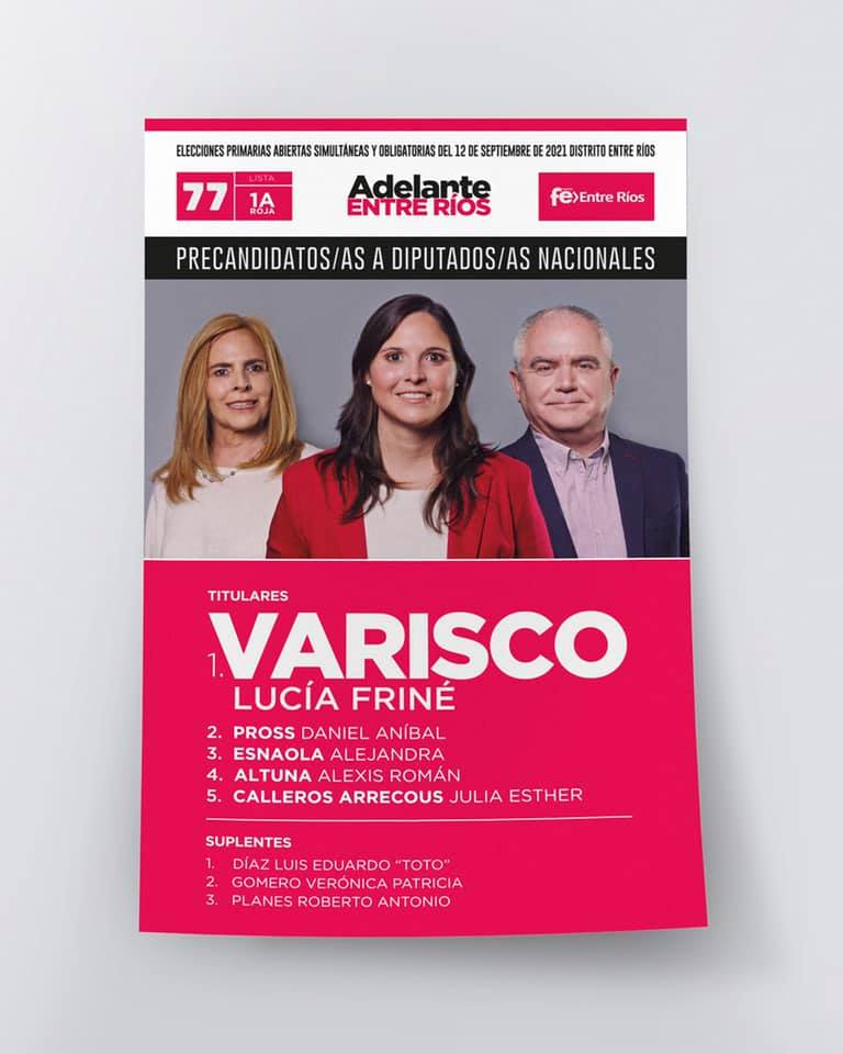 Por fuera de la interna de la coalición se presenta la lista «Fe», 77 1 A, de la actual diputada provincial de Juntos por el Cambio, la radical Lucía Varisco. La acompañan Daniel Pross, Alejandra Esnaola, Alexis Altuna y Julia Calleros.