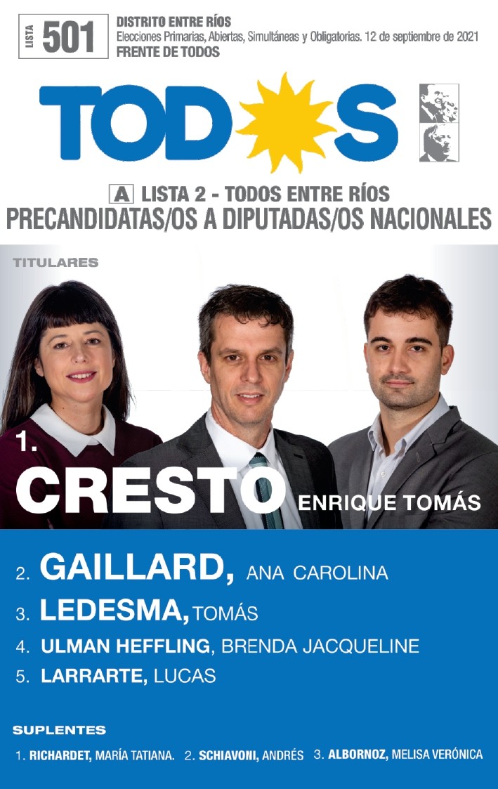El Frente de Todos se presenta con la lista 501, que está encabezada por el actual titular del Ente Nacional de Obras Hidráulicas y Saneamiento Ambiental (Enohsa), Enrique Cresto, junto a Carolina Gaillard, Tomás Ledesma, Brenda Ullman y Lucas Larrarte.