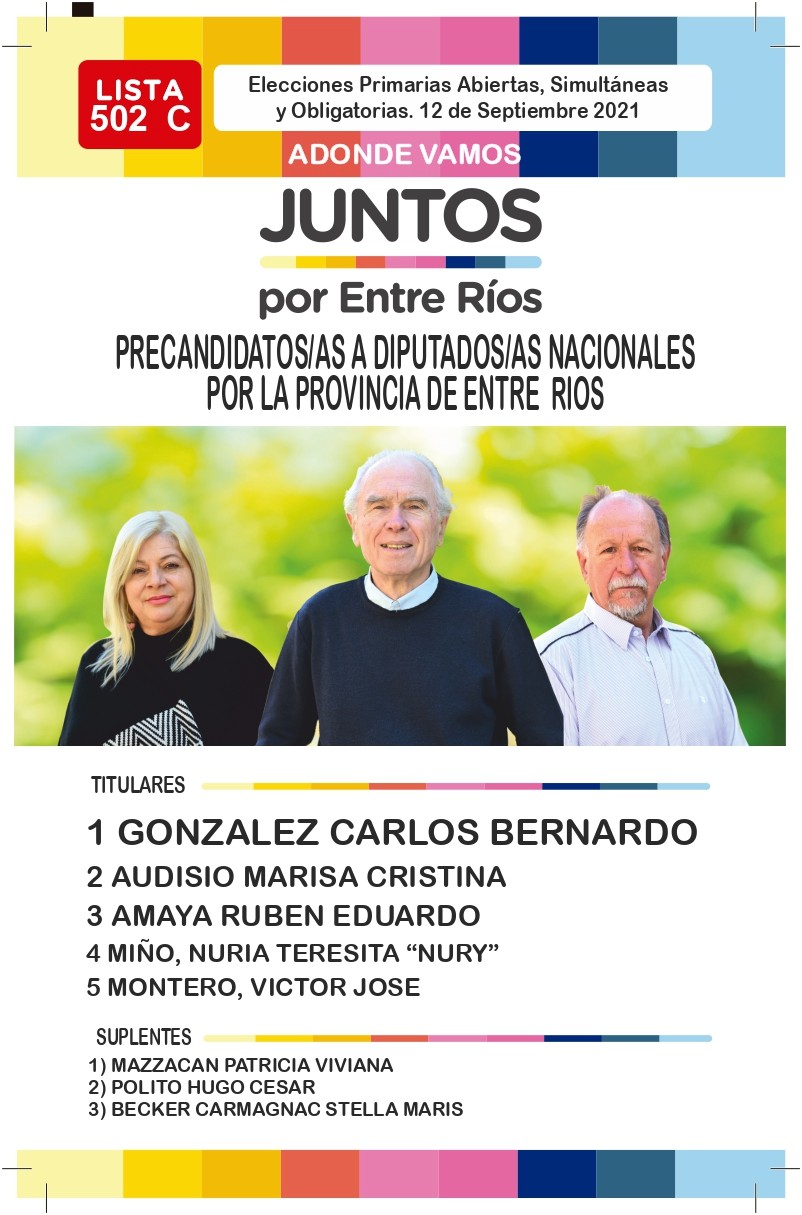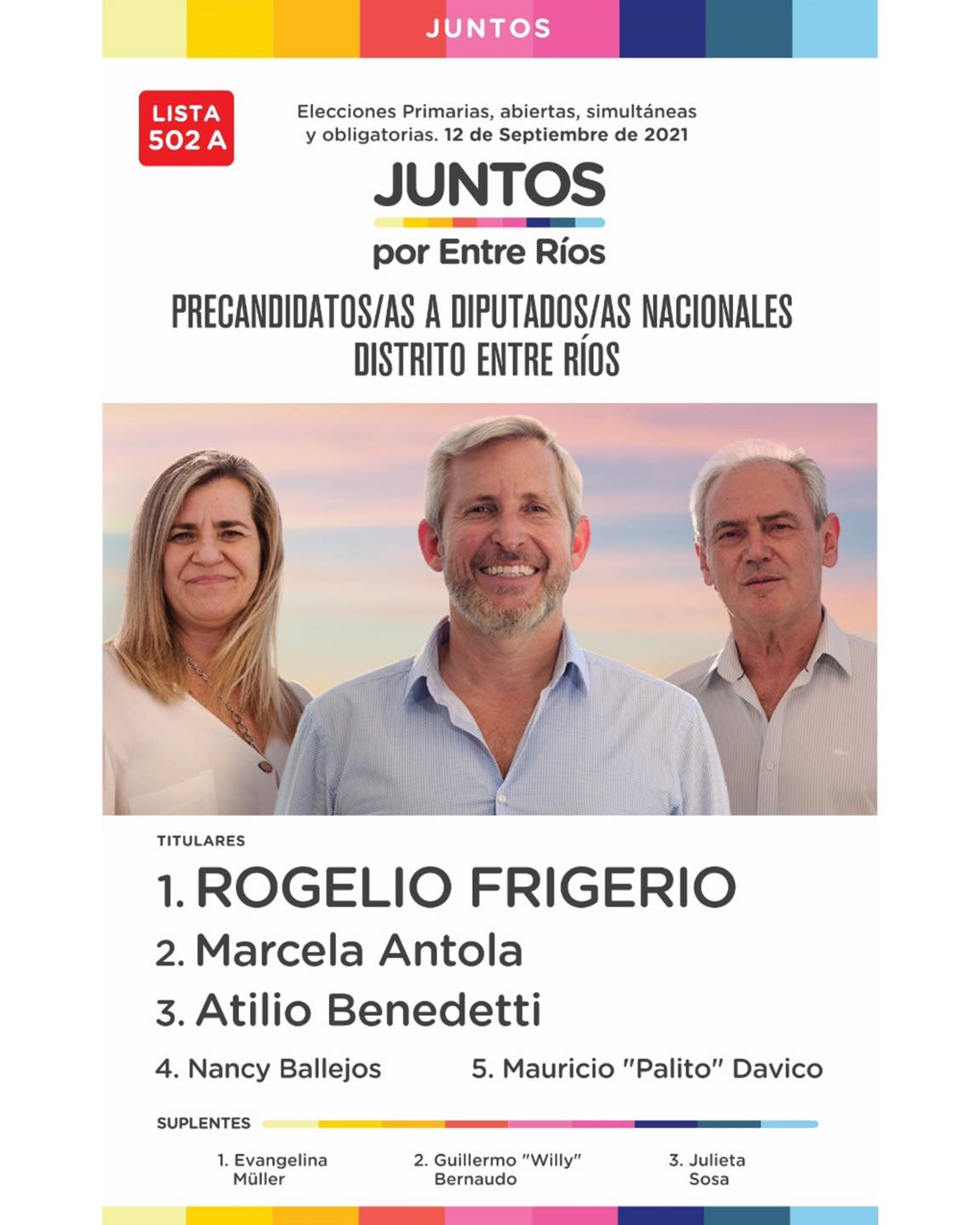 La lista “Juntos” 502 A, es la que encabeza el ex ministro del Interior macrista, Rogelio Frigerio, y le siguen Marcela Antola y Atilio Benedetti, Nancy Ballejos y Mauricio Davico.