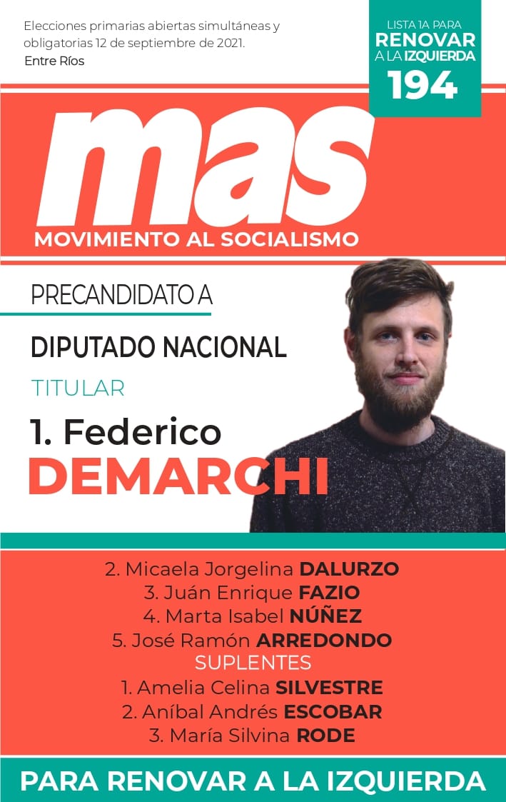 El Movimiento Al Socialismo (MAS), que a nivel nacional se referencia con la paranaense Manuela Castanieria, presenta la lista 194. La encabeza Federico Demarchi, acompañado por Micaela Dalurzo y Juan Fazio.