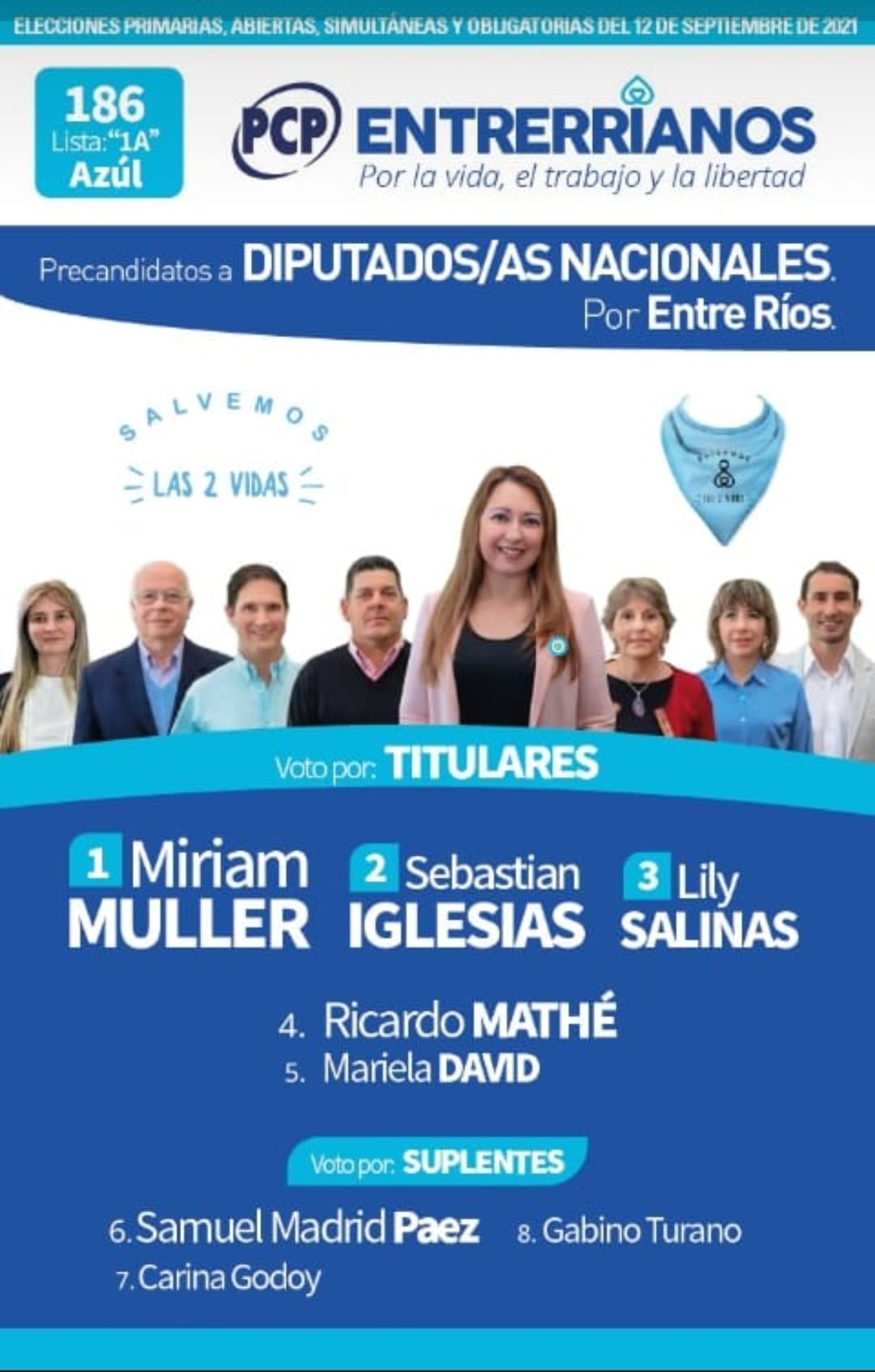 La abogada Miriam Müller, apoderada del partido NOS en Entre Ríos, se presenta como precandidata a diputada nacional por una lista celeste, que se manifiesta en contra de la Ley de Interrupción Voluntaria del Embarazo (IVE). La nómina se denomina “EntrerriaNOS por la Vida, el Trabajo y la Libertad”. Los partidos que la integran son el Partido Conservador Popular y el Partido NOS.