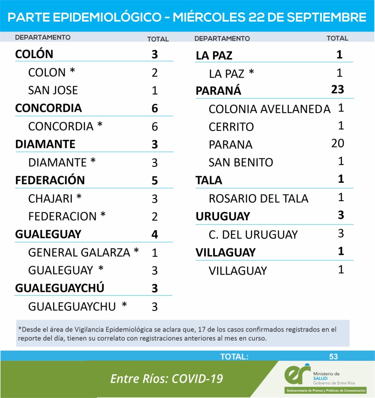 Asimismo, cabe destacar que, 17 de los casos confirmados registrados en el reporte del día, tienen su correlato con registraciones anteriores al mes en curso. Dichos casos corresponden a las localidades de: Colón (2), Concordia (5), Diamante (1), Chajarí (3), Federación (2), Gualeguay (2), General Galarza (1) y La Paz (1).