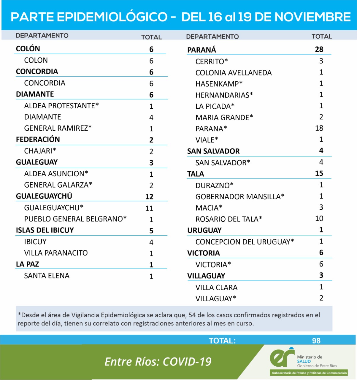 Se destacó que, 54 de los casos confirmados registrados en el reporte del día, tienen su correlato con registraciones anteriores al mes en curso. Dichos casos corresponden a las localidades de: Aldea Asunción (1), Aldea Protestante (1), Cerrito (3), Chajarí (1), Concepción del Uruguay (1), Durazno (1), General Galarza (1), General Ramírez (1), Gobernador Mansilla (1), Gualeguaychú (7), Hasenkamp (1), Hernandarias (1), La Picada (1), Macia (3), María Grande (1), Paraná (10), Pueblo General Belgrano (1), Rosario del Tala (10), San Salvador (1), Viale (1), Victoria (5), Villaguay (1).