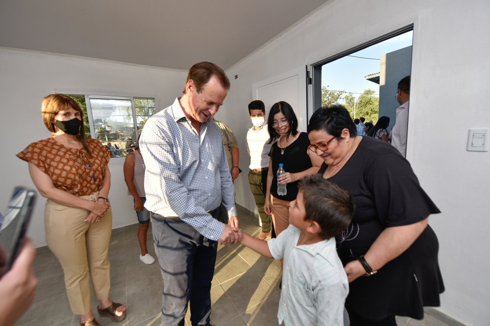 En su discurso, el gobernador dijo: "Es muy gratificante poder estar en esta jornada de trabajo que llevamos adelante con el intendente Niz, para llegar en tiempo y forma, justo antes de las Fiestas cumpliendo con el sueño de 10 familias de tener el techo propio. La municipalidad y el intendente pusieron mucho para que estas viviendas se terminen porque una empresa había quebrado y había que tomar la decisión de llevar adelante la obra y la verdad que la municipalidad hizo un aporte invalorable".