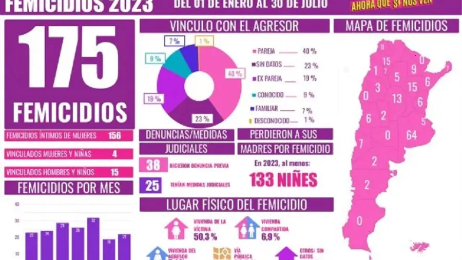 Los datos no distan según la organización que lo produzca. El observatorio Mumalá, mujeres, disidencias y derechos, que tiene de base el monitoreo de medios digitales y gráficos de todo el país, buscadores, sistema de alertas, seguimiento de organizaciones, portales especializados en género, feminismo y policiales señaló en su informe que hasta el 30 de julio hubo 152 femicidios, lo que se traduce en una muerte cada 33. Del total, 128 fueron femicidios directos, tres travesticidios, ocho vinculados de niñas y 13 vinculados de niños. El 22% de mujeres víctimas de femicidios había denunciado a su agresor. En Entre Ríos hubo cinco femicidios.